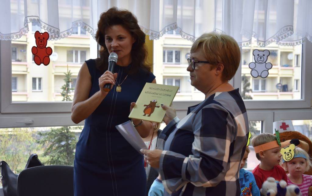 Dzieci wysłuchały również bajki o Dzielnym Niedźwiadku Szczepanie, którą przeczytały im przedstawicielki Powiatowej Stacji Sanitarno-Epidemiologicznej w Rybniku – Katarzyna Majcherczyk, Anna Picho oraz Małgorzata Grabowska. „Był sobie niedźwiadek. Miał na imię Szczepan i futerko w kolorze mlecznej czekolady. Nie, nie mieszkał jak inne misie w lesie lub na biegunie północnym, lecz w przychodni zdrowia, tam gdzie leczy się ludzi. Bo był to niedźwiadek pluszowy. Ale nie taki zwykły, co to siedzi na półce i można się z nim w każdej chwili pobawić. Szczepan miał bardzo ważne zadanie: rozbawiał dzieci, które przychodziły na wizytę do lekarza, doktora Bajkowskiego. Zwłaszcza te, które bały się zastrzyków. Kiedy taki mały pacjent pojawiał się w gabinecie, miał buźkę w podkówkę, jakby zaraz chciał się rozpłakać. Wtedy niedźwiadek wkraczał do akcji. Z pomocą pielęgniarki Leny ochoczo zeskakiwał z sosnowej półki, na której miał swoje miejsce, i rozpoczynał misiowe przedstawienie” – w taki sposób zaczyna się opowieść o Niedźwiadku Szczepanie, którą maluchy słuchały z zapartym tchem.
