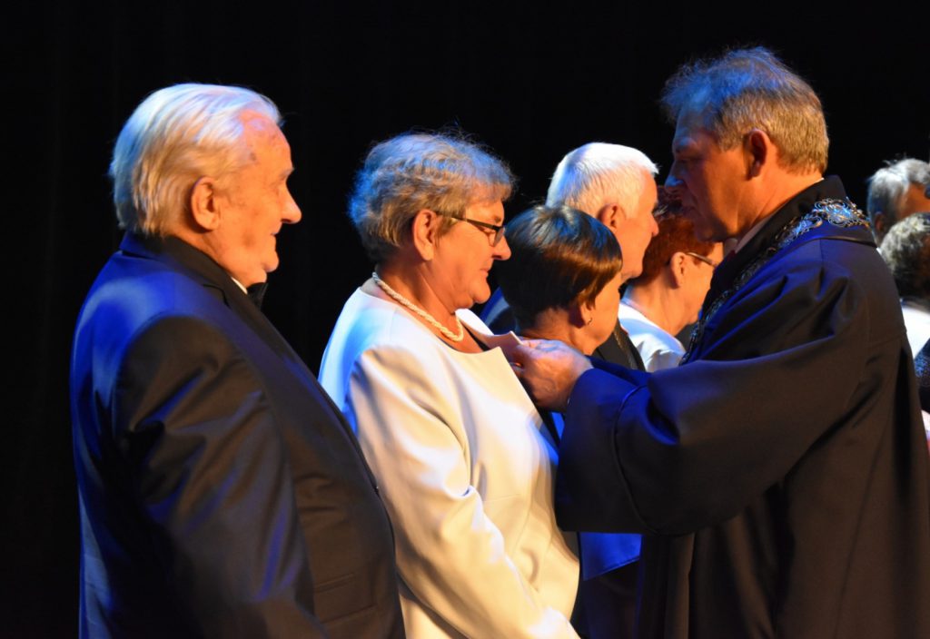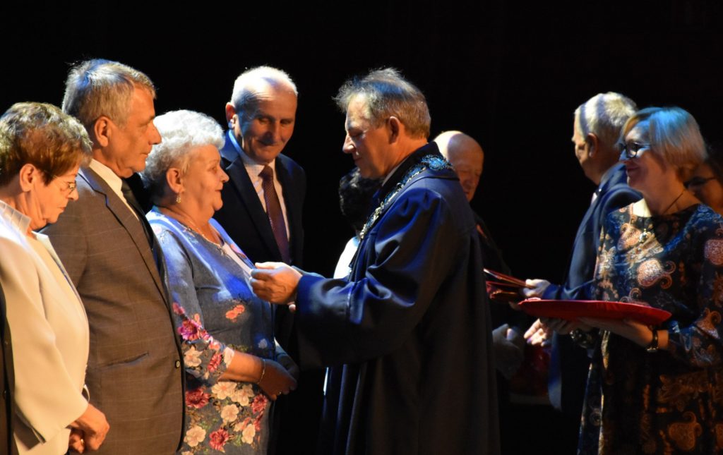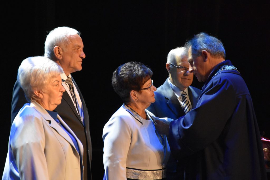 Pary, które w jednym związku przeżyły 50 lat są nagradzane w naszym kraju specjalnym medalem za długoletnie pożycie małżeńskie. Medal ma kształt sześcioramiennej gwiazdy, z jednej strony widnieje napis: „Za długoletnie pożycie małżeńskie”, a z drugiej znajdują się dwie srebrzyste róże. „Drodzy jubilaci, z pewnością pamiętacie tę chwilę, kiedy związaliście się węzłem małżeńskim, przyrzekając sobie nawzajem miłość, wierność i uczciwość małżeńską. Towarzyszyły Wam wówczas radosne twarze waszych najbliższych, rodziców, rodzeństwa, krewnych i znajomych. Życzyli Wam wszelkiej pomyślności na nowej drodze życia. Z pewnością przyświecała Wam wówczas mniej lub bardziej dostrzegalna nuta obawy i zatroskania u progu startu w nieznaną przyszłość, ale Wy, pełni odwagi i młodzieńczego zapału, śmiało weszliście na wspólną drogę życia – mówiła Kornelia Warzecha, kierownik Urzędu Stanu Cywilnego. – Życie nauczyło Was wiele. Nauczyło Was szanować człowieka, wielkość związku małżeńskiego, zahartowało cierpieniem. Pozwoliło Wam ugruntować wzajemną miłość, jedność i przywiązanie, a bogactwem swego serca i doświadczenia rozwijać i doskonalić założoną wówczas rodzinę” – dodała.