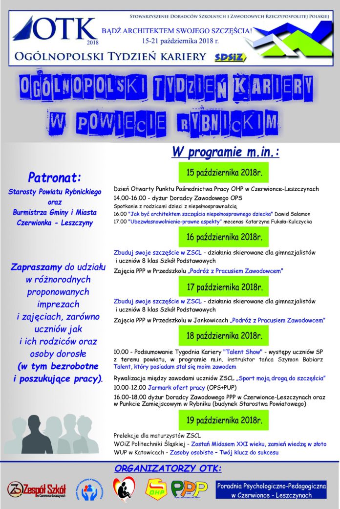 W programie tegorocznego Ogólnopolskiego Tygodnia Kariery w powiecie rybnickim znalazły się m.in. dyżury doradców zawodowych, występy uczniów, prelekcje, zajęcia dla najmłodszych „Podróż z Pracusiem Zawodowym ” (16.10. – w Przedszkolu nr 1 w Czerwionce-Leszczynach oraz 17.10. – w Przedszkolu w Jankowicach), spotkania oraz zajecia dla uczniów szkół. Dodatkowo, 18 października w Miejskim Ośrodku Kultury w Czerwionce-Leszczynach (ul. Wolności 2) odbędzie się także Jarmark Ofert Pracy.