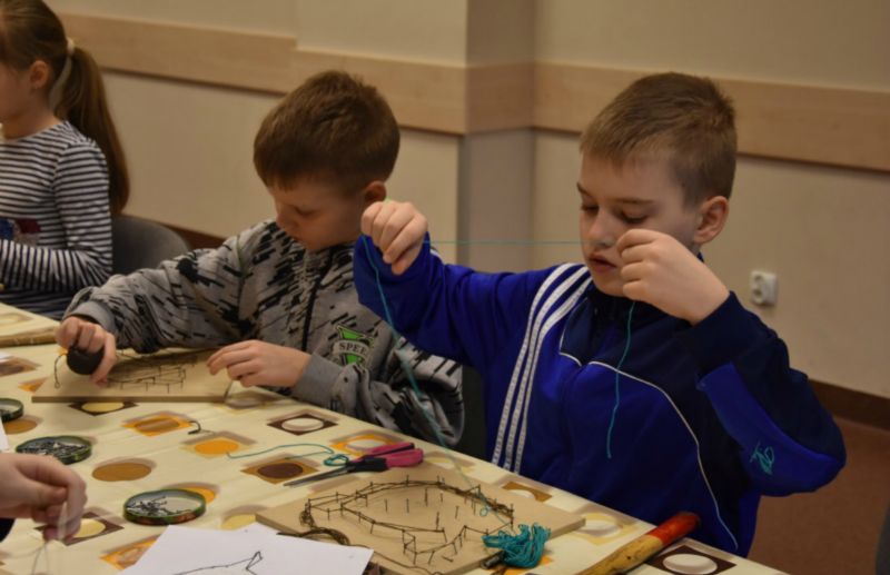 Najmłodsi, którzy 1 lutego wzięli udział w warsztatach w Centrum Kulturalno-Edukacyjnym mogli przekonać się, że do stworzenia obrazów, zamiast kredek czy farb, mogą posłużyć… gwoździe i nici. Oprócz tego niezbędne są również młotek, deska-sklejka oraz wydruk szablonu. Chociaż być może początkowo brzmi to tajemniczo, to jednak, jak przyznali uczestnicy warsztatów, wcale nie jest takie trudne. Pierwszym krokiem jest odrysowanie na desce szablonu, który później chcemy uzyskać. Następnie, na liniach wbijamy gwoździe, które wyznaczą nam kontury naszego obrazka. Następnie, pomiędzy wbitymi gwoździami przeplatamy kolorową nitkę lub kordonek – trzeba pamiętać tylko o tym, żeby rozpocząć i zakończyć przeplatanie zawiązaniem nitki lub kordonka na supeł.