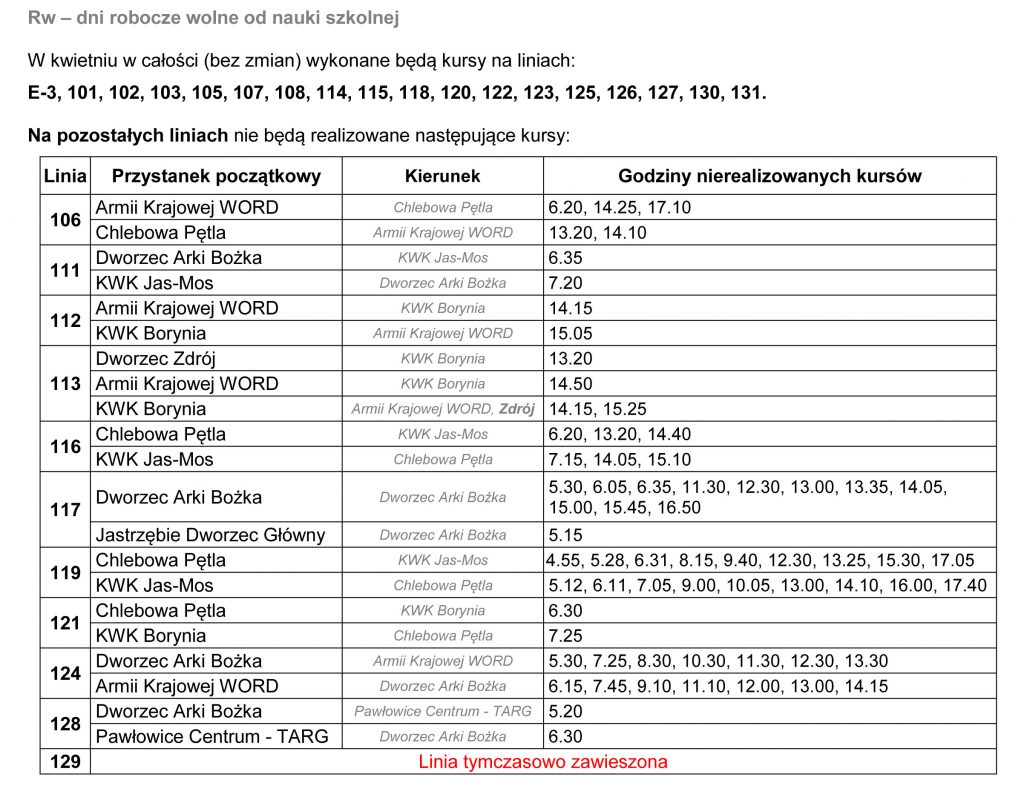 W okresie świątecznej przerwy szkolnej (dni robocze) nie wszystkie kursy zostaną wykonane, dlatego warto zapoznać się z tabelą: