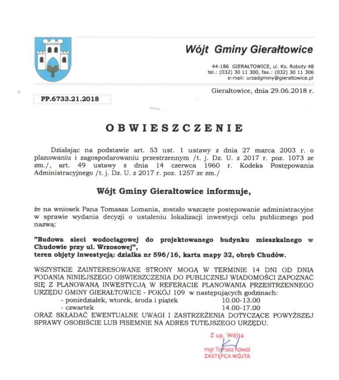 NewsyGierałtowiceInformacje Gierałtowice: Budowa sieci wodociągowej do projektowanego budynku mieszkalnego w Chudowie przy ul. Wrzosowej Przez iknurowAg - 2 lipca 2018 0 26 Podziel się na Facebooku Tweet (Ćwierkaj) na Twitterze Obwieszczenie Budowa sieci wodociągowej do projektowanego budynku mieszkalnego w Chudowie przy ul. Wrzosowej Info: gieraltowice.pl
