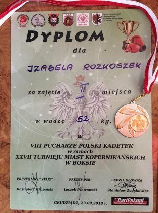 Iza rozpoczęła drogę do finału od walki ćwierćfinałowej gdzie spotkała się z zawodniczką klubu BKS Skorpion Szczecin Magdaleną Tylendą. Walkę wygrała pięściarka z Gierałtowic w 2 rundzie przez RSC.Tym samym Iza zapewniła sobie brązowy medal imprezy. W walce półfinałowej przeciwniczką Izy była zawodniczka klubu Ziętek Team Brzeziny Wiktoria Kabzińska.I tym razem zawodniczka Gardy również pokonała rywalkę w 2 rundzie przez RSC tym samym zameldowała się w ścisłym finale !Tam na naszą pięściarkę czekała dwukrotna Mistrzyni Polski zdobywczyni Pucharu Polski z 2017 roku Karolina Ampulska z klubu Wda Świecie. Po bardzo dobrej walce w wykonaniu obydwóch zawodniczek zwyciężyła bardziej doświadczona Karolina Ampulska 3-0. Tym samym Izabela Rozkoszek została Wicemistrzynią Pucharu Polski Kadetek na 2018 rok . Po zdobyciu brązowego medalu Ogólnopolskiej Olimpiady Młodzieży , srebrnego medalu Międzynarodowych Mistrzostw Śląska jest to trzeci medal Izy w 2018 roku z bardzo prestiżowej imprezy!Izie serdecznie gratulujemy wielkiego sukcesu jaki osiągnęła na Grudziądzkim ringu i czekamy na kolejne !