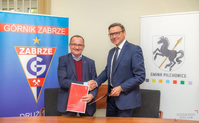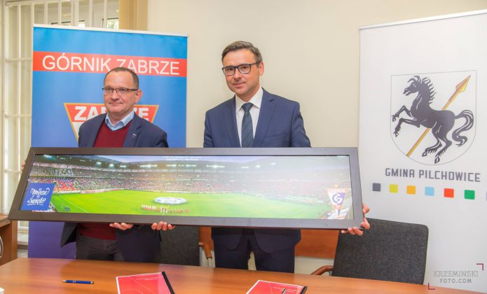 Wójt Maciej Gogulla oraz Andrzej Pasek z Górnika Zabrze podpisali umowę na promocję gminy.