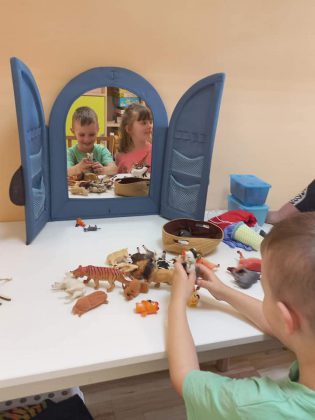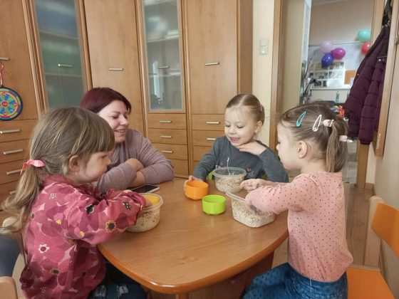 Dla dzieci wielką atrakcją były warsztaty wykreowane przez pedagożki i logopedki. Wspólnie cieszono się zabawami logopedycznymi, ruchowymi, muzycznymi, słuchowymi i plastycznymi. Dzieci uczyły się poprzez zabawę – odbyło się mini przedstawienie z pacynkami, gimnastyka buzi i języka na wesoło, zabawy oddechowe z bańkami, balonikami i dmuchajkami. Dziewczynki i chłopcy tworzyli z mas plastycznych oraz materiałów kreatywnych, utrwalali nazwy kolorów i bawili się z chustą animacyjną. Wielki zapał obudziło poszukiwanie małych przedmiotów zakopanych w mieszance kaszy, ryżu i cieciorki. Najmłodsi ozdabiali jajka wielkanocne, wykonali wiosenne kwiaty i zwierzęta z plasteliny, które umieszczane były na podkładkach imitujących ich środowisko życia – ślimak znalazł się na trawie, rybka trafiła do wody.