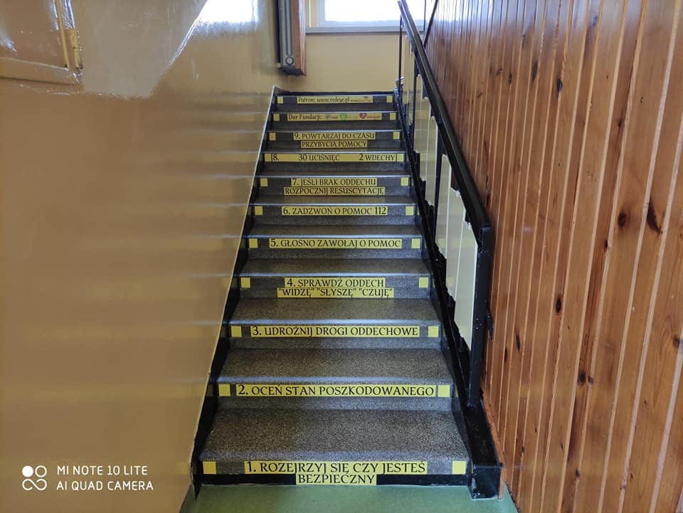 Wchodząc po schodach, dzieci i młodzież będzie miała okazję na co dzień przypominać sobie, jak postępować w przypadku ratowania życia ludzkiego.