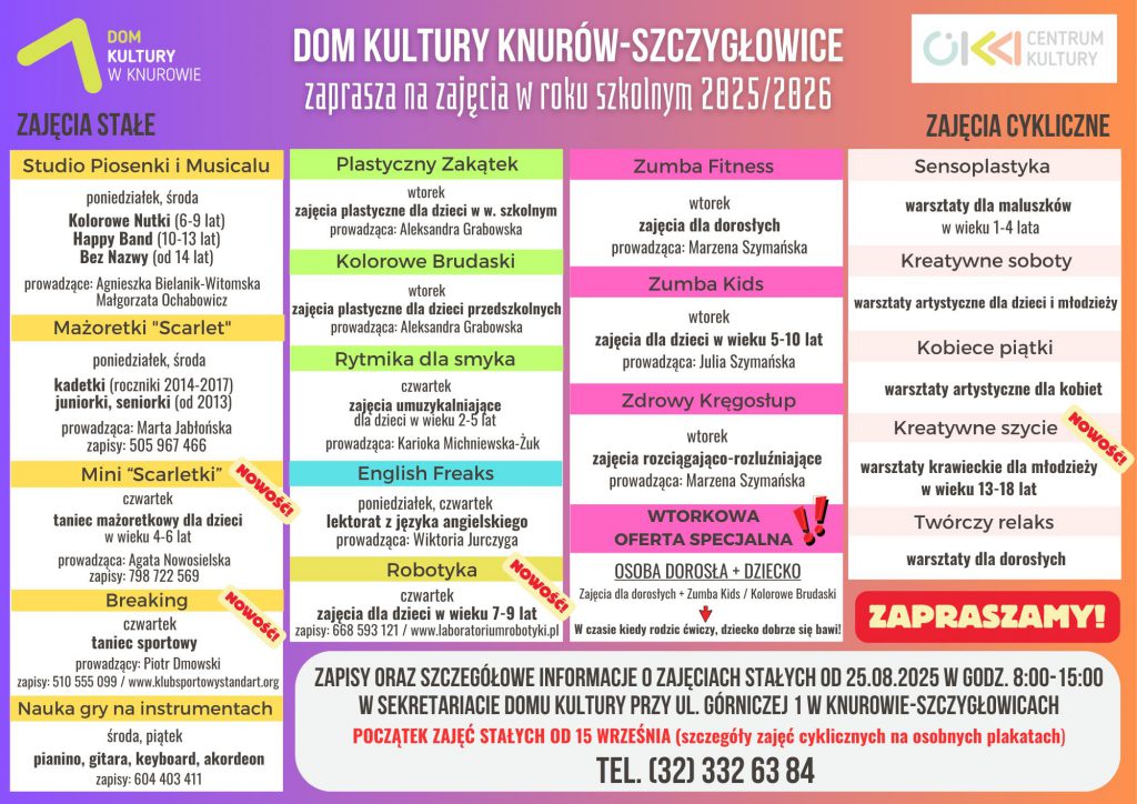 Zapisy i szczegółowe informacje o zajęciach stałych będą dostępne od jutra w godzinach 8:00-15:00 w sekretariacie Domu Kultury przy ul. Górniczej. Kontakt telefoniczny pod numerem 32 332 63 84. To świetna okazja, by aktywnie rozpocząć nowy rok szkolny i rozwijać swoje pasje w przyjaznej atmosferze.