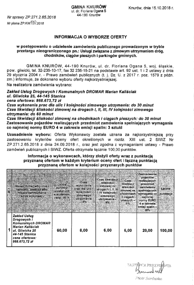 W połowie października knurowski magistrat, dokonał wyboru oferty w postępowaniu o udzielenie zamówienia publicznego prowadzonego w trybie przetargu nieograniczonego pn. „Usługi związane z zimowym utrzymaniem dróg, chodników, ciągów pieszych i parkingów gminnych”.