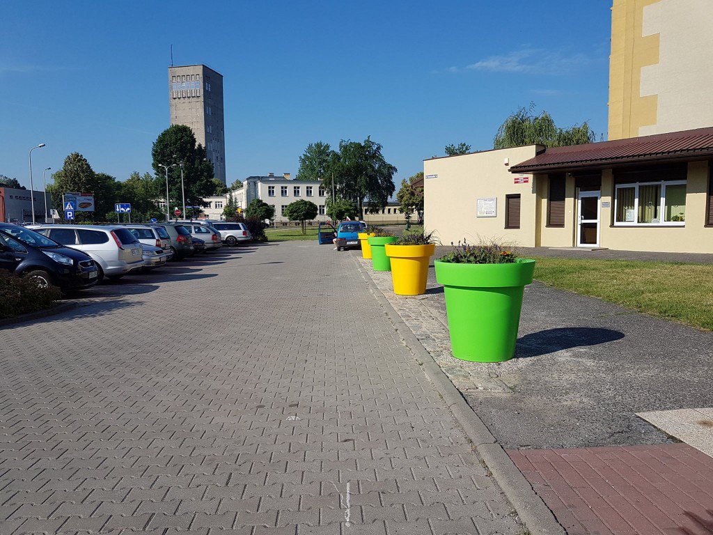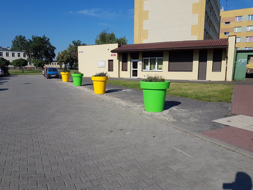 Cztery plastikowe donice posłużą jako zabezpieczenie przed parkującymi w tym miejscu samochodami, przy okazji dając możliwość uzielenienia.