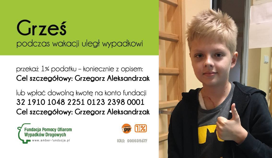 W tym roku chcą pomóc w powrocie do zdrowia Grzesiowi, który w ubiegłe wakacje uległ ciężkiemu wypadkowi komunikacyjnemu. Więcej informacji o Grzesiu można znaleźć klikając w poniższy link: