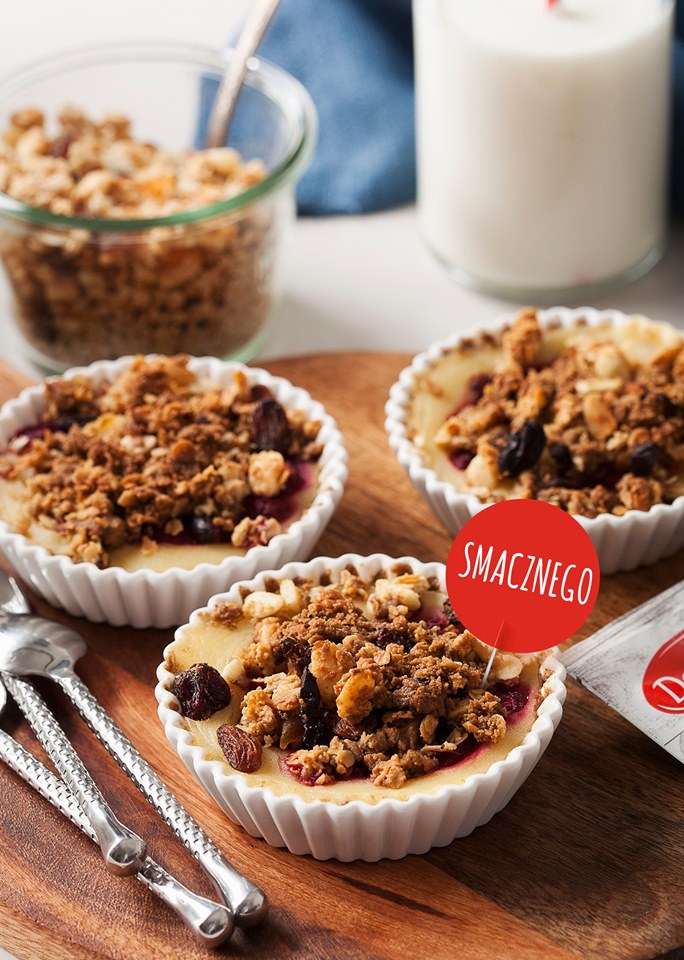 Zapiekany budyń z malinami i kruszonką