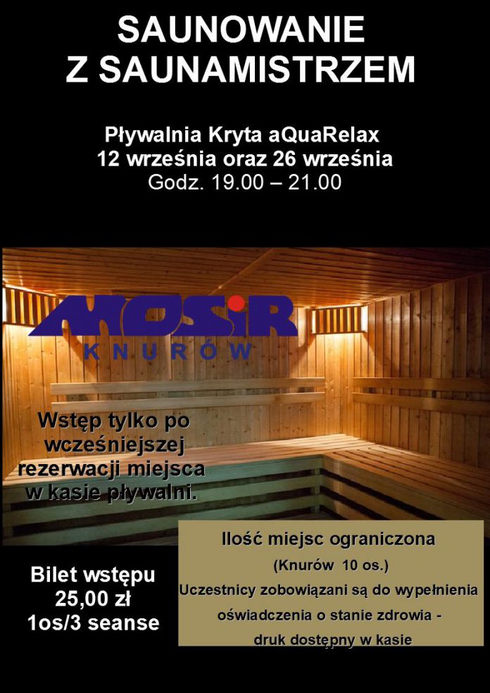 Okazja do skorzystania z seansów pod okiem saunamistrza w środy: 12 i 26 września. Wszystkie szczegóły na plakacie, obowiązuje limit miejsc.
