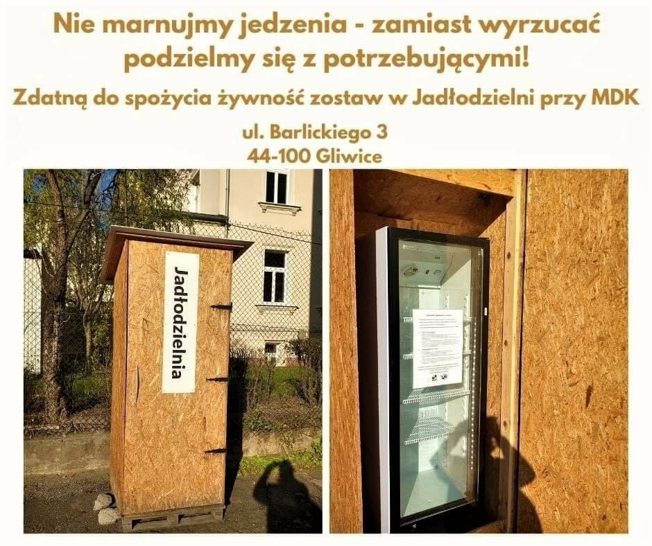 Od kwietnia 2019 roku w Gliwicach na dziedzińcu przy ulicy Barlickiego 3 (za Młodzieżowym Domem Kultury) działa tzw. Jadłodzielnia – miejsce, w którym możemy podzielić się nadmiarem żywności z potrzebującymi, zamiast ją wyrzucać. Ta wspaniała inicjatywa to efekt współpracy Pana Pawła Kobylińskiego – Posła na Sejm RP VIII kadencji, Stowarzyszenie Animatorów Wszechstronnego Rozwoju Młodzieży oraz Cała Naprzód; Jadłodzielnia jest dostępna od poniedziałku do soboty w godzinach 6:00 – 21:00.