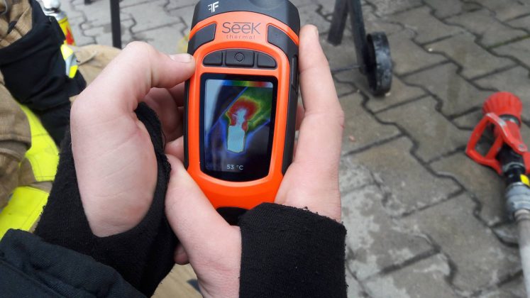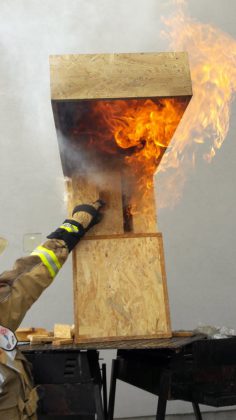 Po wykładzie przeprowadziliśmy pokaz rozwoju pożaru na makiecie typu „domek dla lalek”, który zademonstrował m.in. rozgorzenie, zapalanie się gazów pożarowych i wsteczny ciąg płomienia.