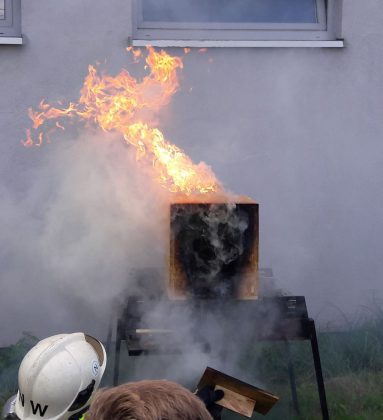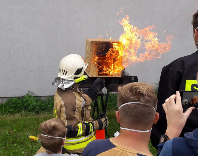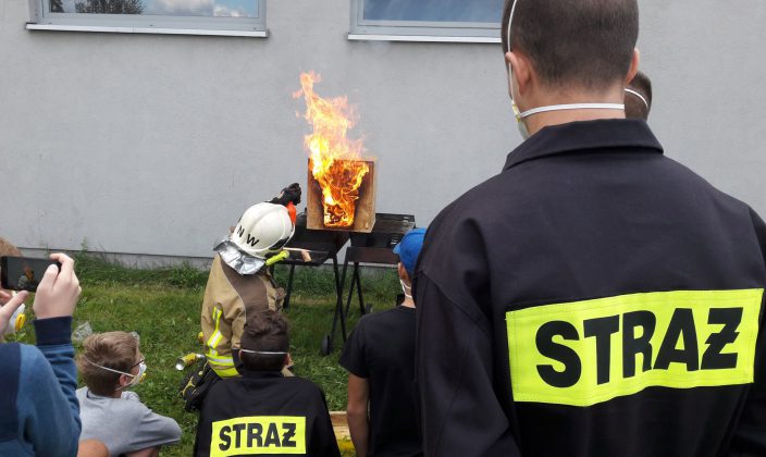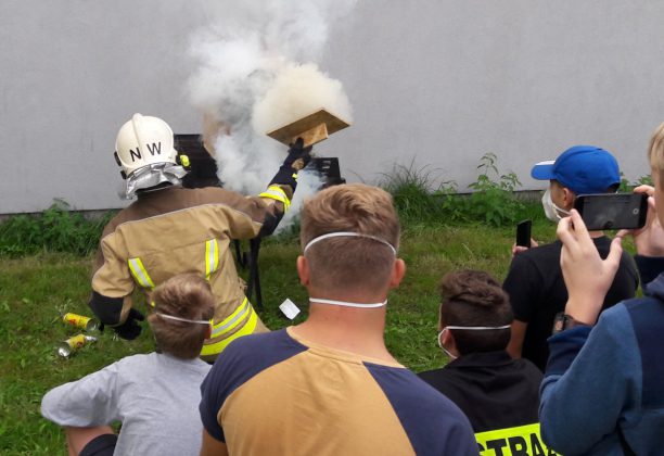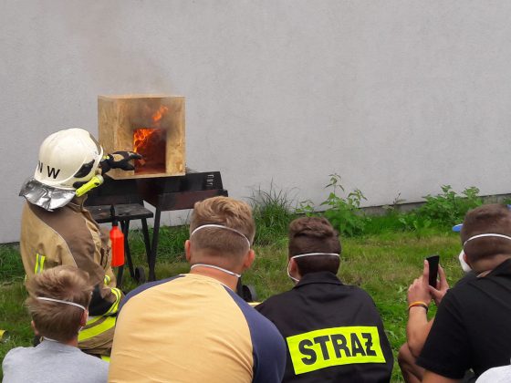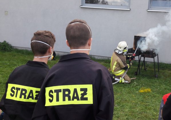 Na sali omówiliśmy podstawy rozwoju pożaru, zaś na świeżym powietrzu, zobaczyliśmy demonstrację rozwoju pożaru na makiecie typu „domek dla lalek”, z omówieniem niebezpiecznych zjawisk, jakie podczas takiego pożaru mogą wystąpić.