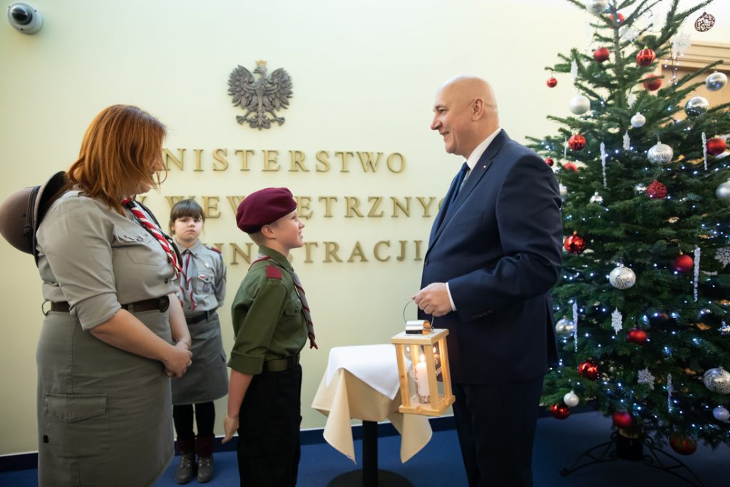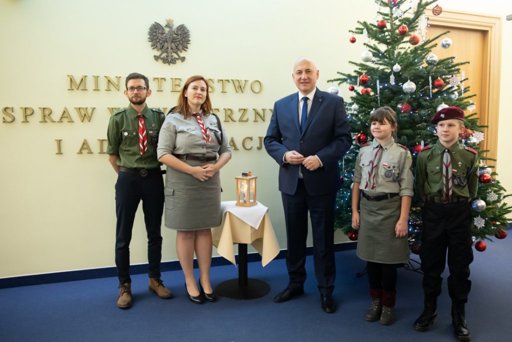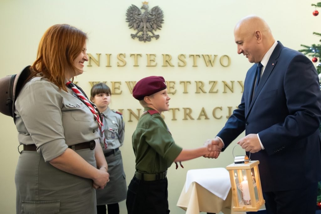 Minister Joachim Brudziński przyjął od harcerzy Betlejemskie Światło Pokoju. Bożonarodzeniowa akcja przekazywania symbolicznego płomienia, który wędruje z Groty Narodzenia Pańskiego w Betlejem, w tym roku odbywa się pod hasłem „Światło, które łączy”.
