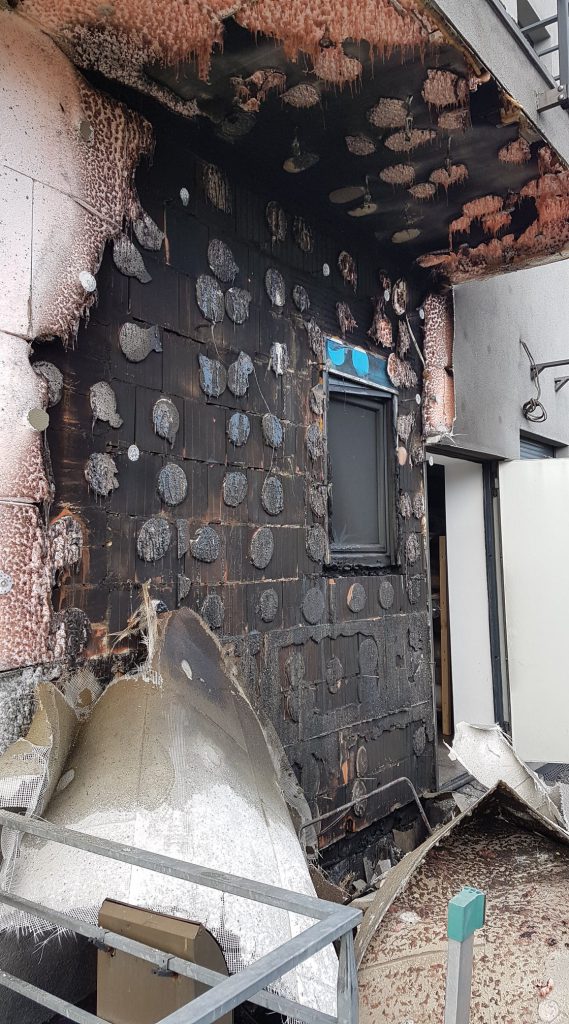 Po dojeździe na miejsce okazało się, że pali się kontener na śmieci oraz że ogniem zajęła się część elewacji budynku. Działania straży pożarnej polegały na dogaszeniu palących się elementów, schłodzeniu i zdjęciu nadpalonej części elewacji, kontroli temperatury za pomocą kamery termowizyjnej oraz przewietrzeniu budynku.