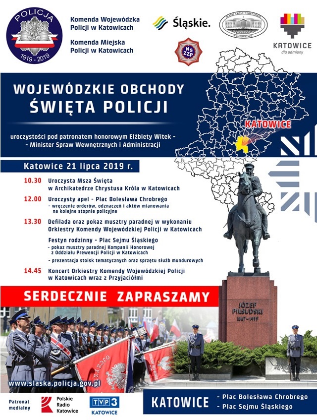 W tym roku policyjne święto jest szczególne, bowiem przypada w 100. rocznicę powstania Policji Państwowej. Z tej okazji wydarzenie przybierze jeszcze bardziej uroczysty charakter. W naszym garnizonie wojewódzkie obchody Święta Policji pod patronatem honorowym Minister Spraw Wewnętrznych i Administracji odbędą się 21 lipca 2019 roku przed pomnikiem Marszałka Józefa Piłsudskiego na Placu Bolesława Chrobrego w Katowicach. Po oficjalnej części spotkania, przed Śląskim Urzędem Wojewódzkim w Katowicach, odbędzie się wyjątkowy festyn z licznymi atrakcjami dla uczestników i sympatyków policyjnej formacji.