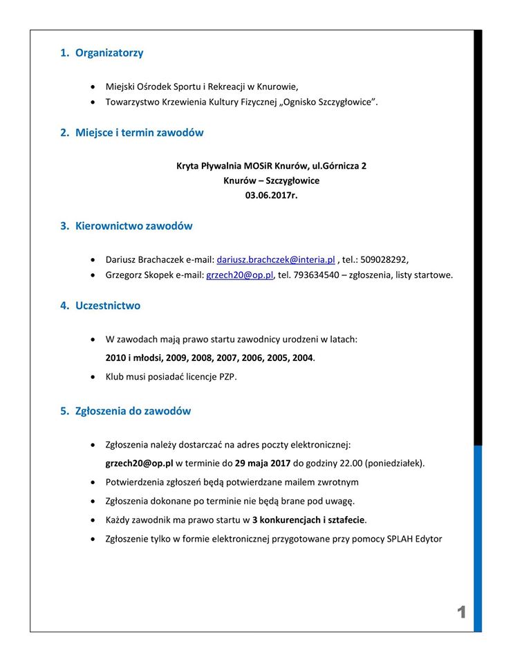 TKKF Ognisko Szczygłowice oraz MOSiR Knurów serdecznie zapraszają na Regionalny Miting Pływacki, który odbędzie się w sobotę 3 czerwca na pływalni krytej MOSiR przy ulicy Górniczej 2 w Knurowie-Szczygłowicach. Zawody te organizowane są z okazji obchodów Dnia Dziecka, a prawo startu mają dzieci trenujące w klubach z roczników 2011-2004. Rozpoczęcie rywalizacji i pierwsze starty o godz. 10.00. Serdecznie zapraszamy do kibicowania młodym pływakom.