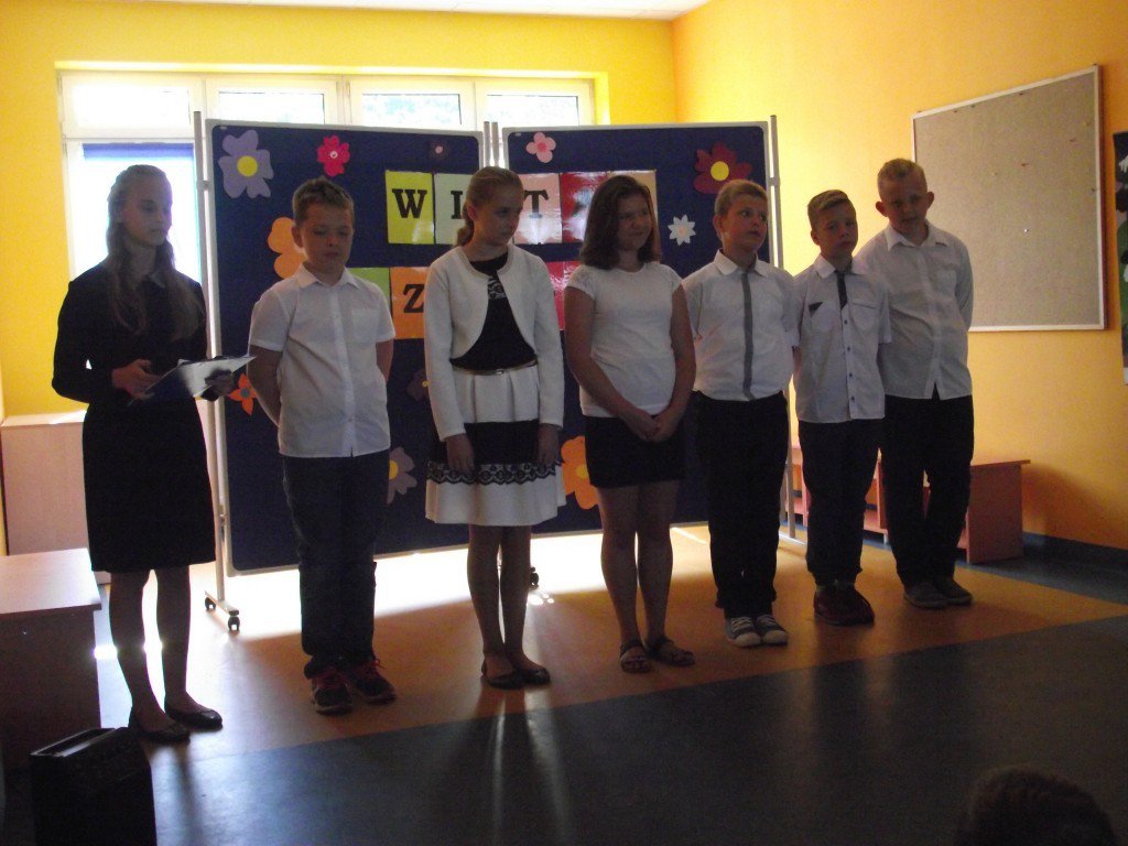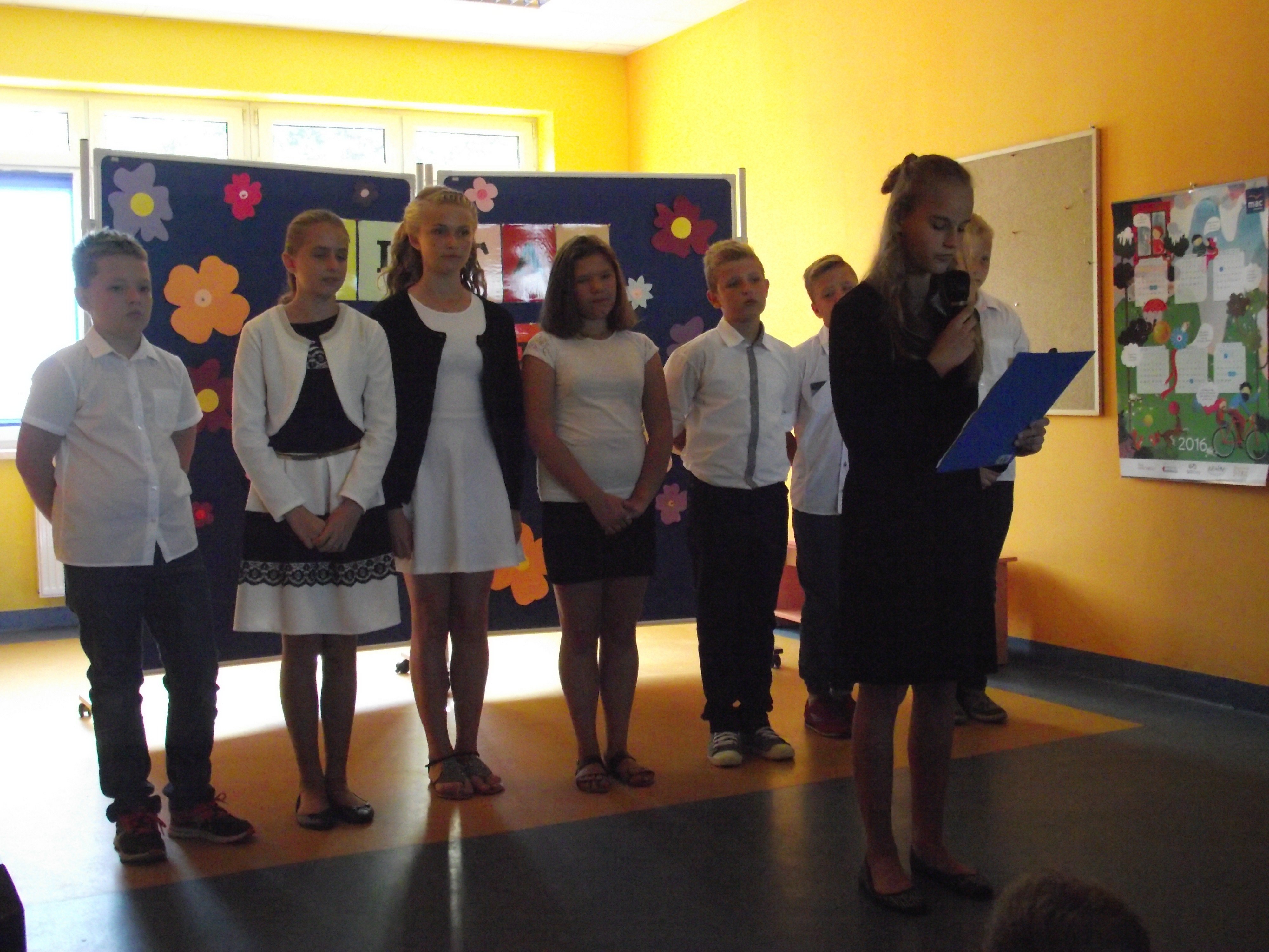 Uczniowie wypoczęci i uśmiechnięci najpierw wysłuchali pani dyrektor Barbary Iwanickiej, która powitała wszystkich obecnych i przedstawiła plan na nowy rok szkolny, a następnie uczniów powitali akademią koleżanki i koledzy z klasy VI pod przewodnictwem pani Agnieszki Foik i pani Doroty Stradomskiej.