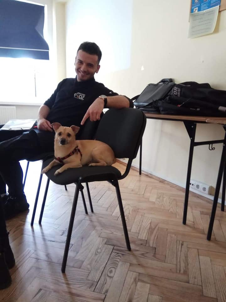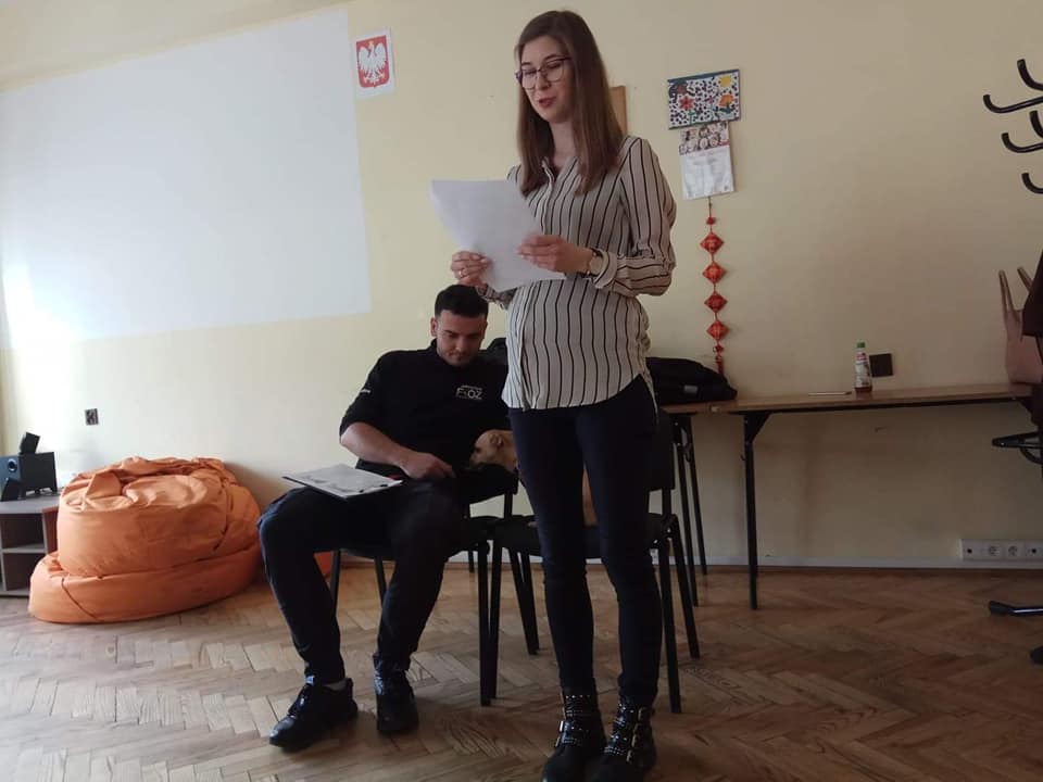 Podczas prelekcji prezentowano działania Fundacji oraz rozmawialiśmy o losie zwierząt w kontekście Ustawy o Ochronie Zwierząt. Pan Kevin przybył wraz z wolontariuszką panią Asią. Towarzyszył im również uroczy piesek Mela.